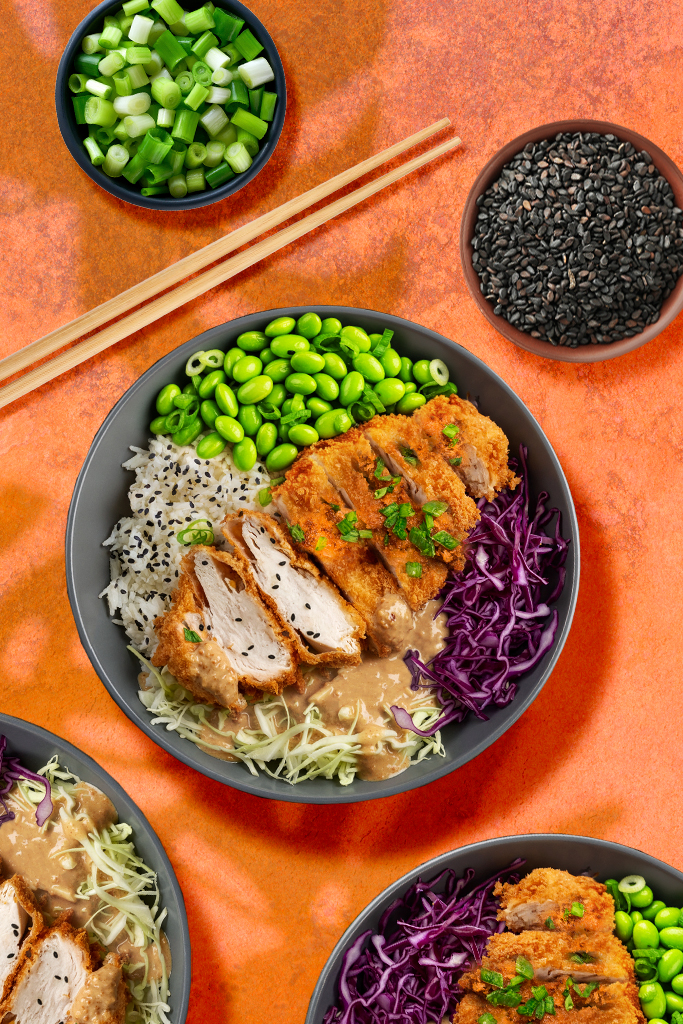 Prepare the Pre-cooked Poke Rice according to the package directions. Slice the spring onions. Place a portion of rice in each bowl. Arrange the cabbage and edamame beans alongside. Arrange the chicken neatly on top. Drizzle with the Sesame Dressing and sprinkle with the Black Roasted Sesame Seeds and spring onions.