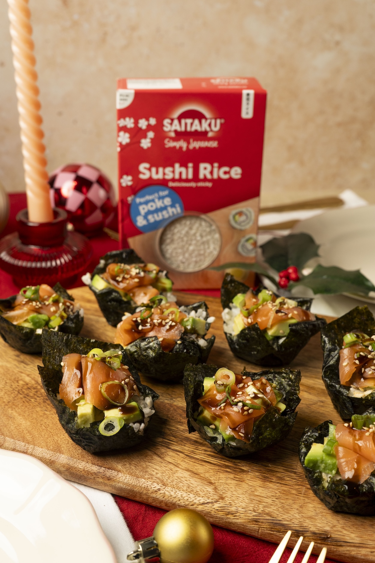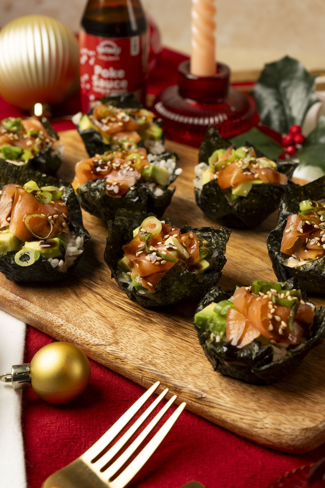Perfect festive bites filled with sushi rice, smoked salmon, avocado and spring onion – ideal for Christmas sharing.