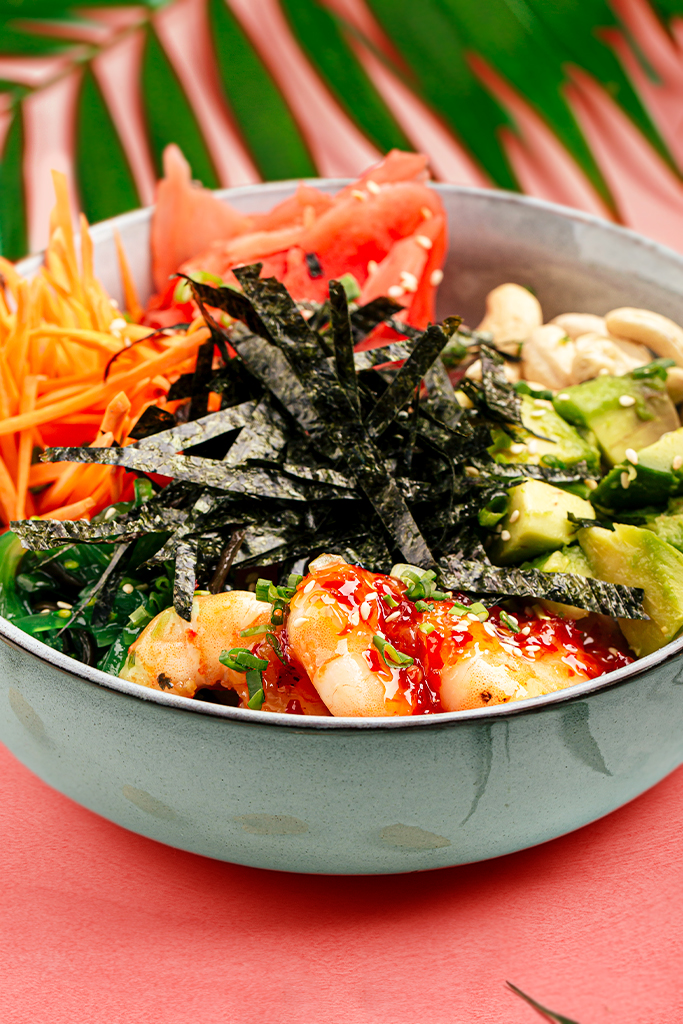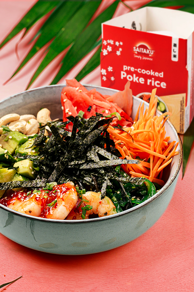 Assemble bowls with Pre-cooked Poke Rice, wakame salad, carrots, Sushi Ginger or Poke Sticks, cashews, avocado, and sweet chilli shrimp.
