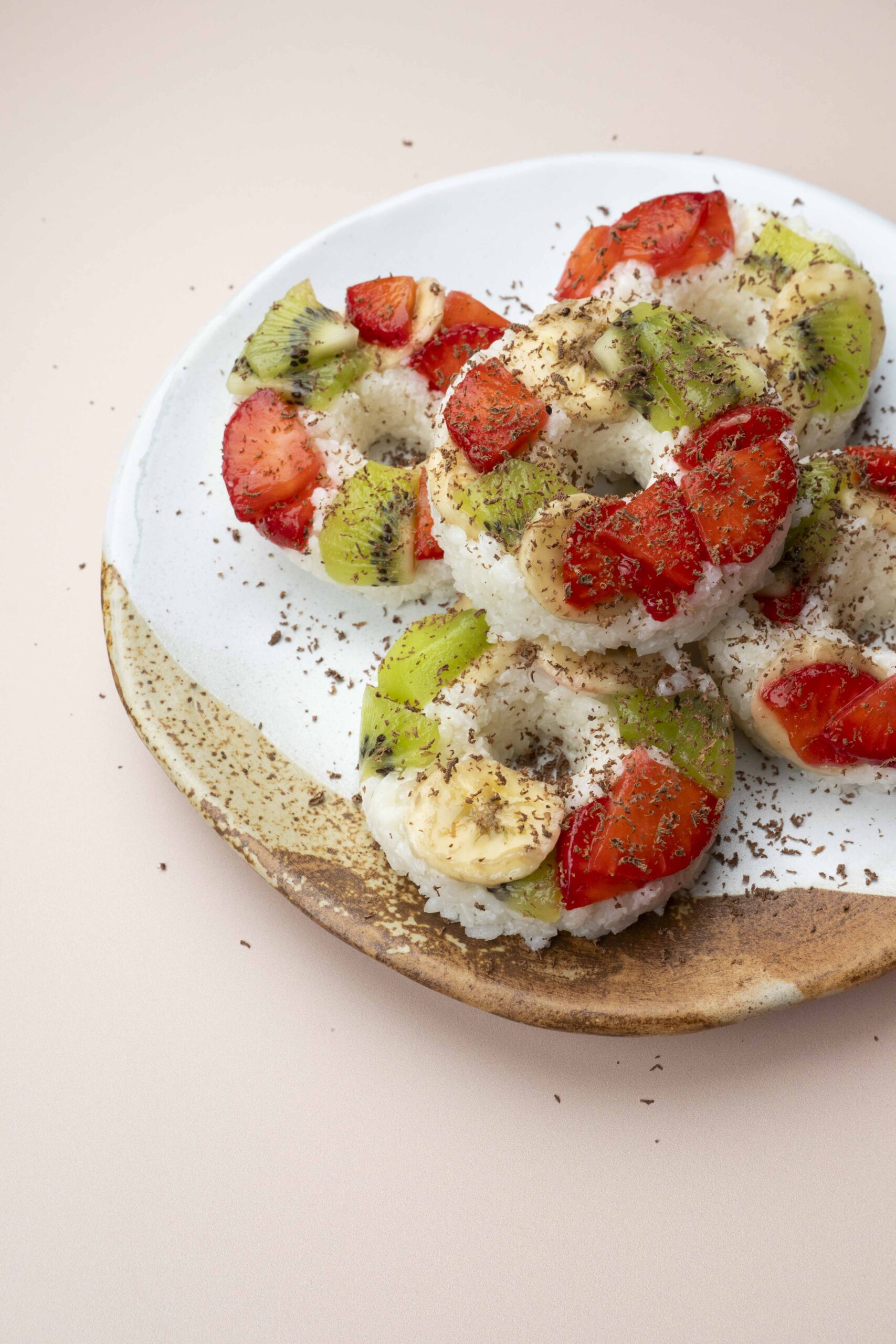 Once chilled, carefully remove each sushi donut onto a plate and grate over some dark or milk chocolate to decorate. Enjoy!