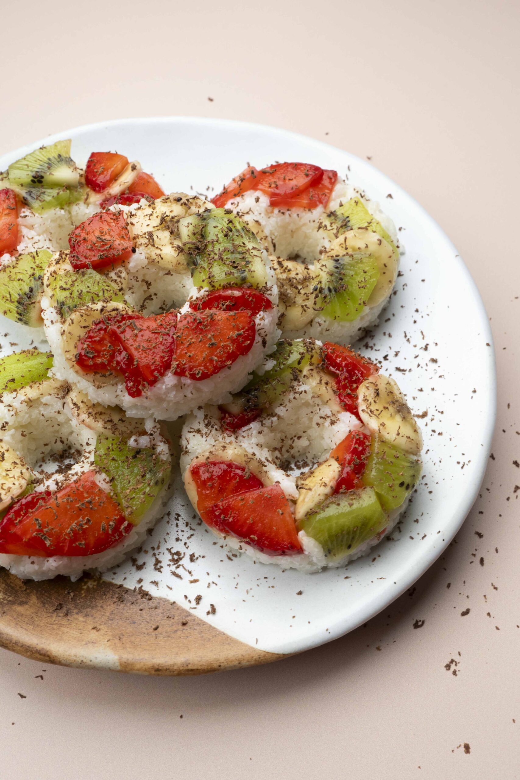 Once cooled, add your rice into the donut tray on top of the fruit, flattening with a spoon to form a flat base for your sushi donuts.