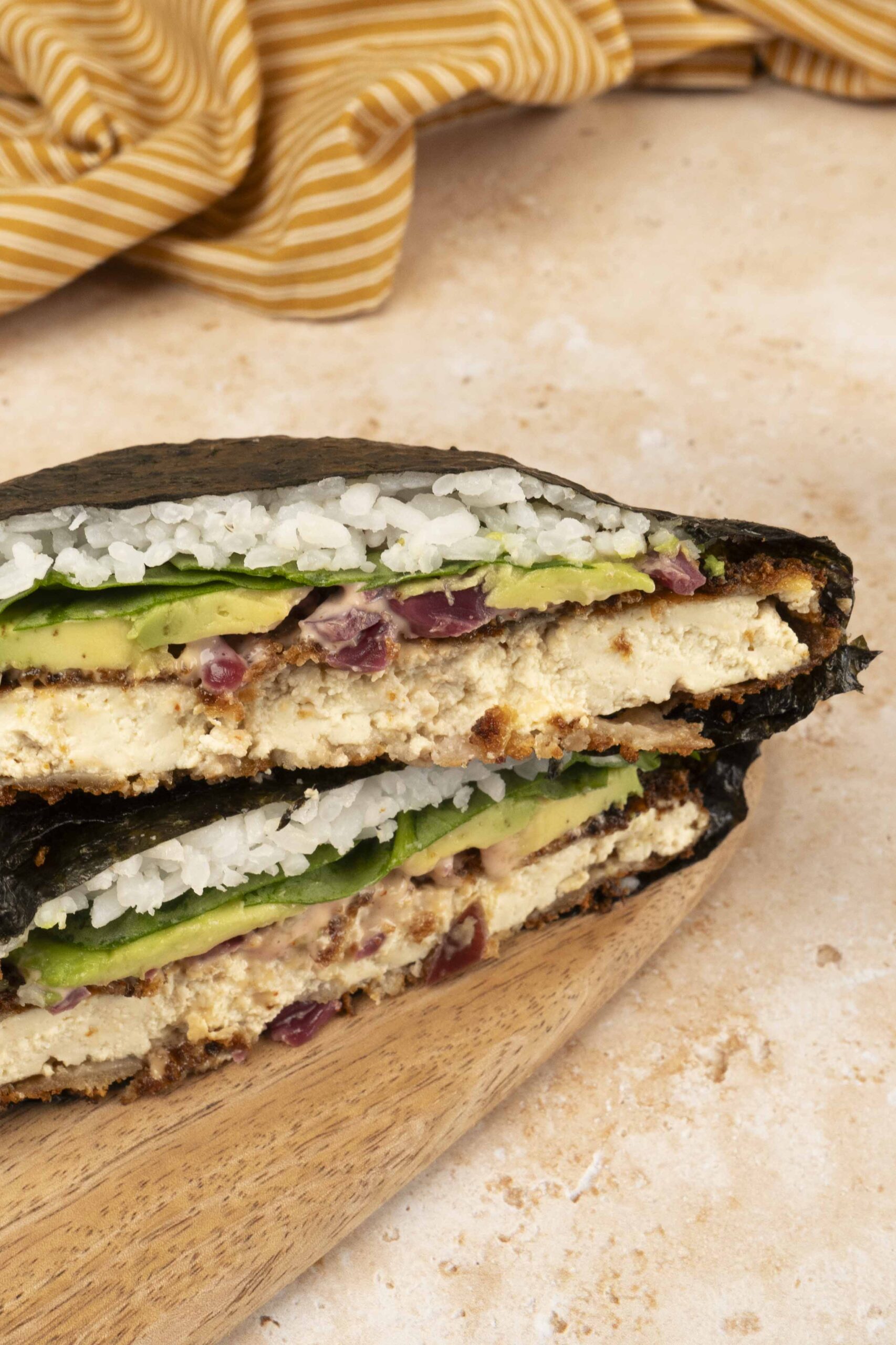 Wet the edges of the nori sheet before folding in each corner to the middle, and wrapping tightly with the cling wrap. Put something weighted on top of the sushi sandwich and set aside for a few minutes to allow the nori to hold.
