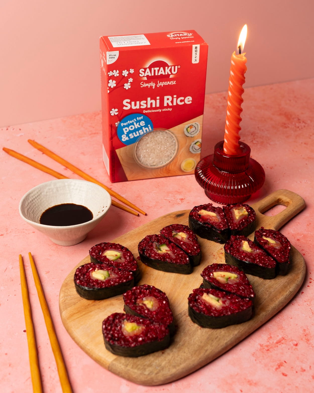 Give your Valentine’s or Galentine’s night a colourful twist with this adorable heart-shaped sushi. By adding a splash of beetroot juice to our Saitaku Sushi Rice, you get that romantic red that’s almost too pretty to eat.